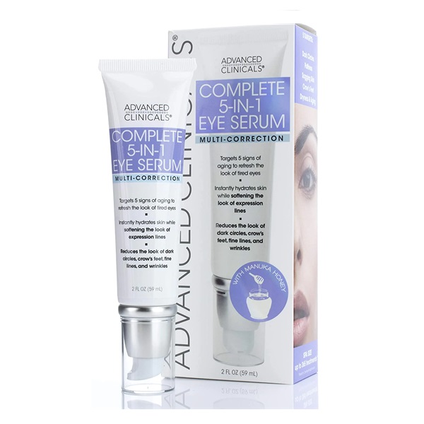 Advanced Clinicals 5-in-1 Multi Correction Eye Serum utilizes Plant Collagen, Manuka Honey, Collodial Gold, and K3 Vitamin C to target five signs at once making your eyes look visibly renewed. Instantly hydrates skin while diminishing the look of dark circles, bags, puffiness, lines, and crepey eyelids. Our 5-in-1 Eye Serum helps reduce the appearance of wrinkles and crow’s feet while Plant Collagen dramatically improves elasticity to fight tired, saggy eyes.